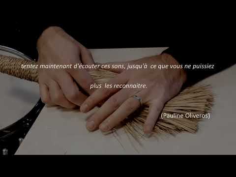 Attentifs, ensemble est une expérience collective de l’attention. Une invitation à synchroniser nos écoutes, par le biais d’une projection de phrases, de suggestions, de citations qui proposent différentes manières d’écouter. Celles-ci façonnent peu à peu un chemin d’écoute, qui s’entrelace à la musique jouée par quatre musiciennes et musiciens, et des « objets vibrants » ; une forme en dialogue en émerge, qui explore la dimension active du processus d’écoute.